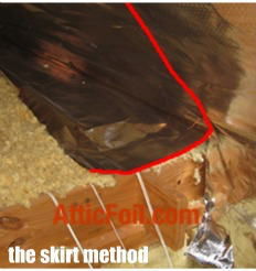 The Skirt method creates a skirt, or overhang of foil. This method is good if you plan on adding additional insulation later. It will act as “backstop” to keep the insulation from blowing into the soffits.