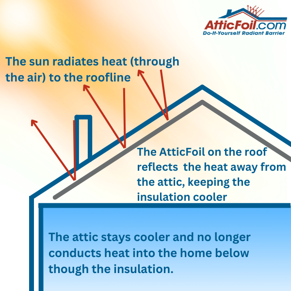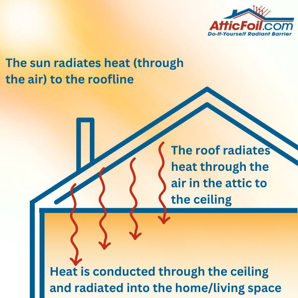 The sun heats up the roof and then the heat is transferred by radiant heat across the attic space until it hits the attic insulation. Then, the heat transfer method switches from radiant heat to conductive heat to move through the attic insulation and into your home. This is why you need BOTH types of insulation. Traditional attic insulation and radiant barrier work together and each do their part. Radiant barrier is your first line of defense (against radiant heat) and traditional attic insulation (fiberglass or cellulose) is the second line of defense against conductive heat gain.