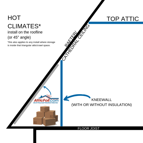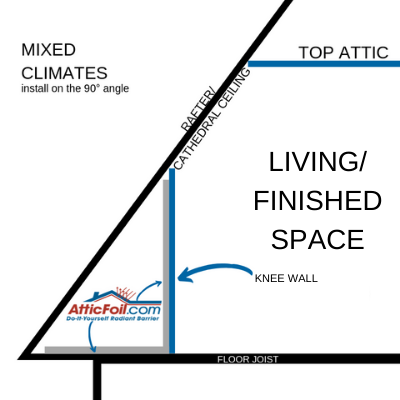 If you don’t have any storage in the crawlspace area outside the knee wall, then you can add AtticFoil™ on the floor of the knee wall area (to prevent heat from the roofline from absorbing into the floor and heating up the living space below that). Otherwise, if you do have storage in the area, you can install AtticFoil™ on the bottom of the roof rafters on the sloping part of the roofline to protect that storage from absorbing heat.