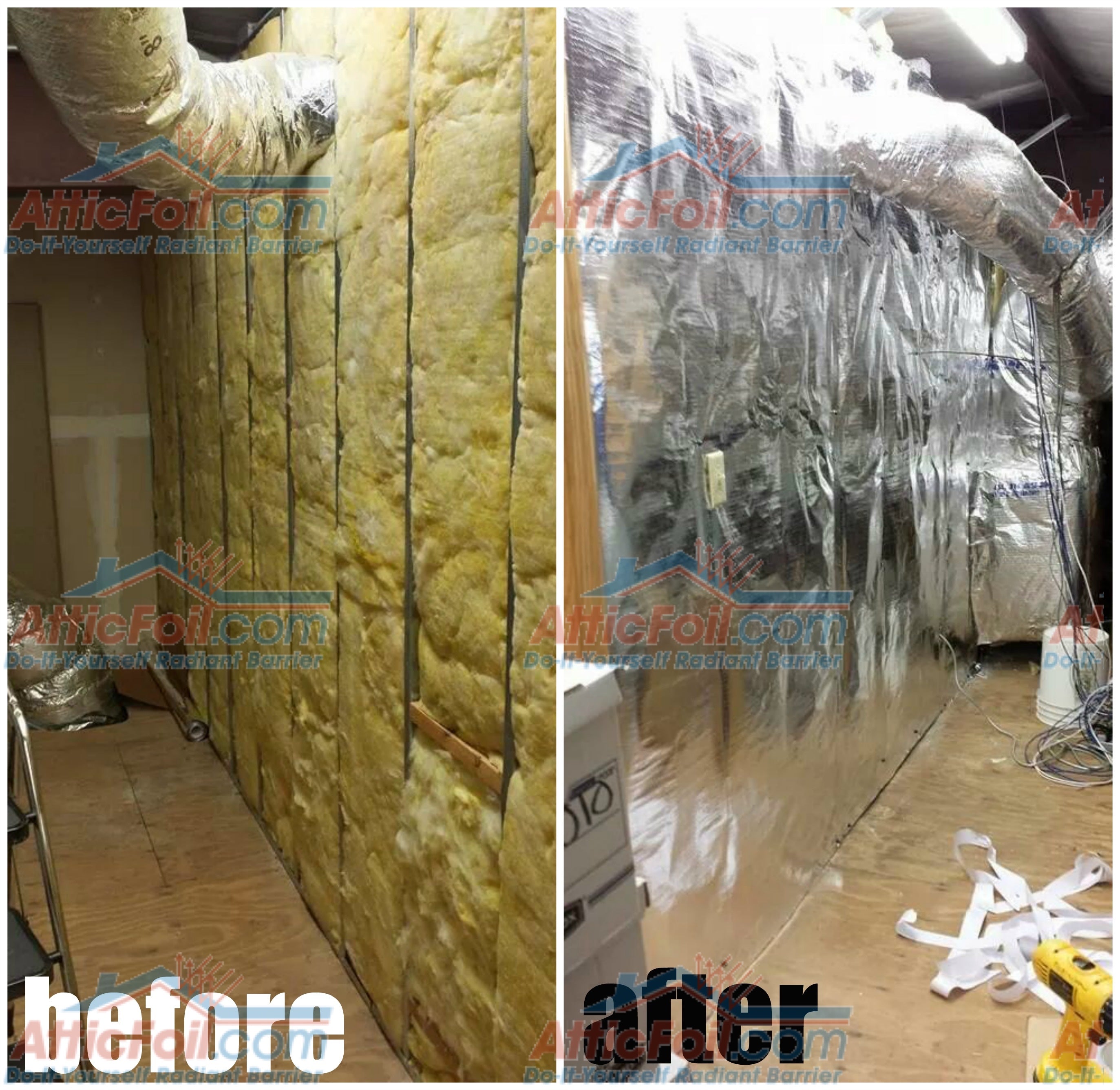 Next, you can add AtticFoil™ on top of the traditional insulation by stapling it to the wall studs. You essentially want to wrap the outside of the room with the radiant barrier.