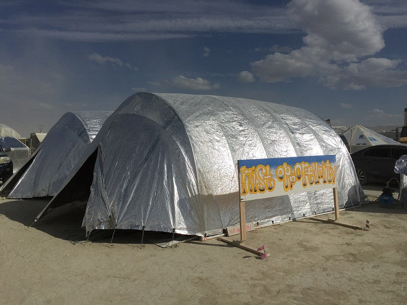 Radiant barrier blocks heat from the sun like nothing else. This customer fashioned a custom tent covering to beat the heat at Burning Man in the desert.